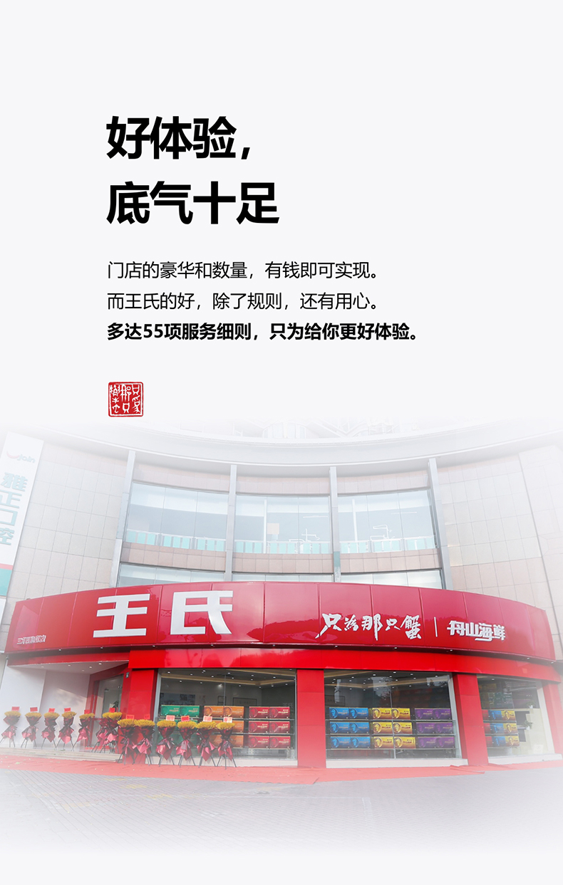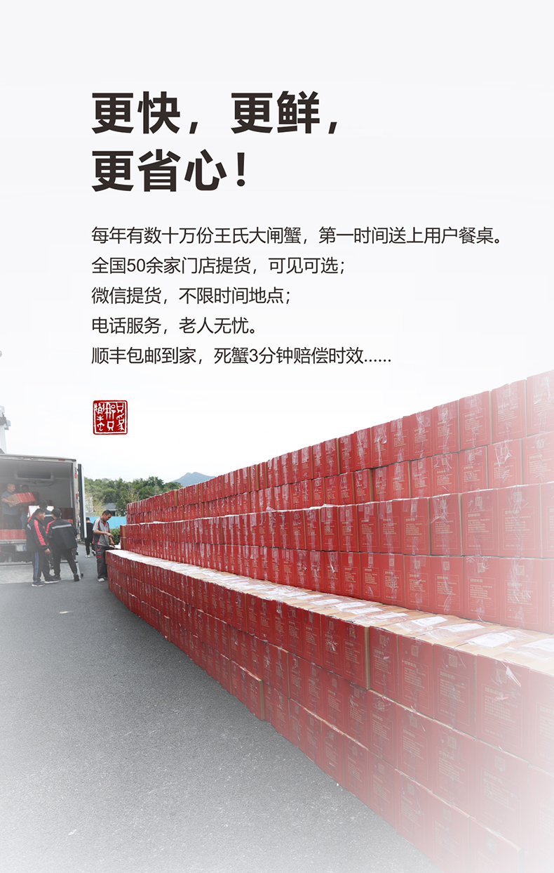| 使用方法: | 线上预约或门店提货 | 温馨提示: | 所售王氏名蟹·只为那只蟹均由王氏直供,只只佩带防伪指环 |