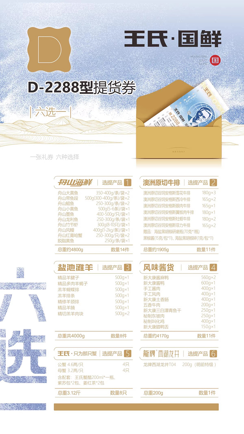 | 产品名称 : | 【6选1】王氏国鲜礼券F套餐 2288型 | 产品品牌 : | 旺大年 |