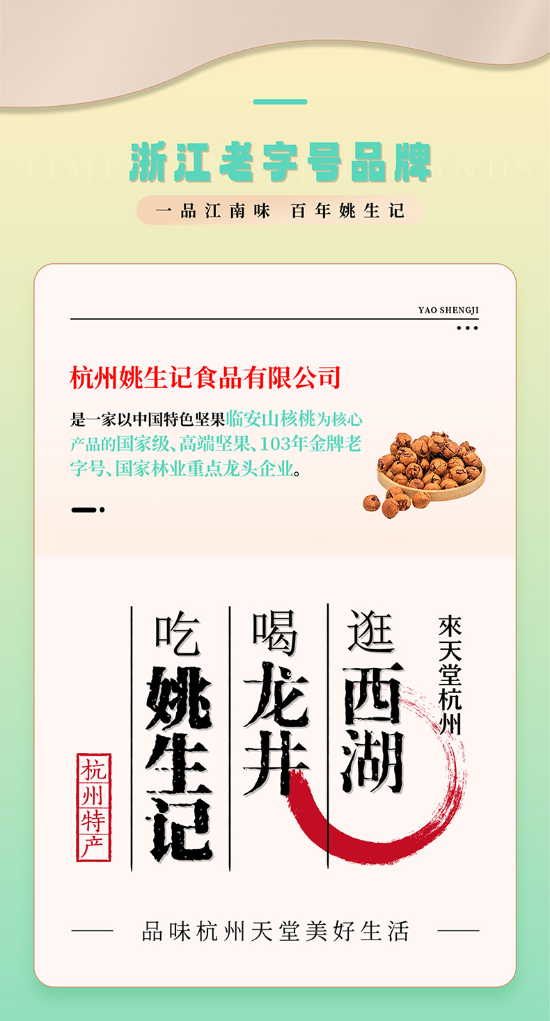 杭州姚生记食品有限公司成立于1998年,公司总部位于杭州市滨江区滨安路1190号,注册资本2000万元,是一家集原料基地建设、研发生产加工、多渠道营销于一体的垂直类综合运营商。