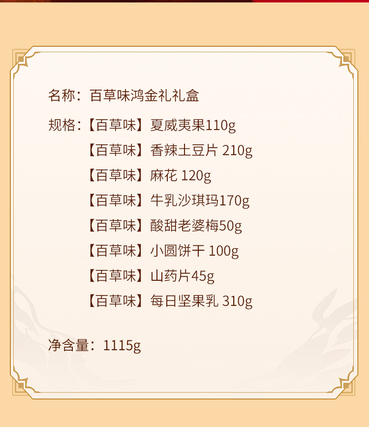 | 产品名称 : | 百草味鸿金礼108型年货礼盒 | 产品品牌 : | |