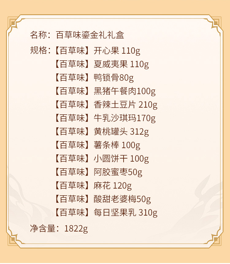 | 产品名称 : | 百草味年货鎏金礼盒208型大礼包 | 产品品牌 : | |