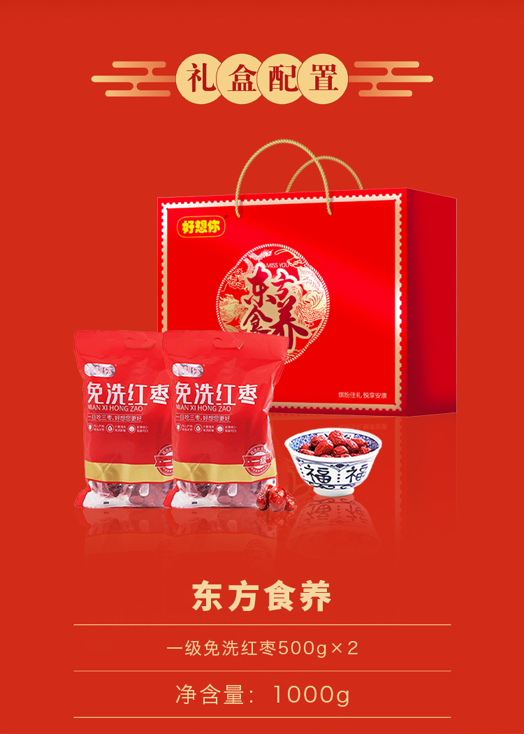 | 产品名称 : | 好想你东方食养礼盒1000g免洗红枣 | 产品品牌 : | |