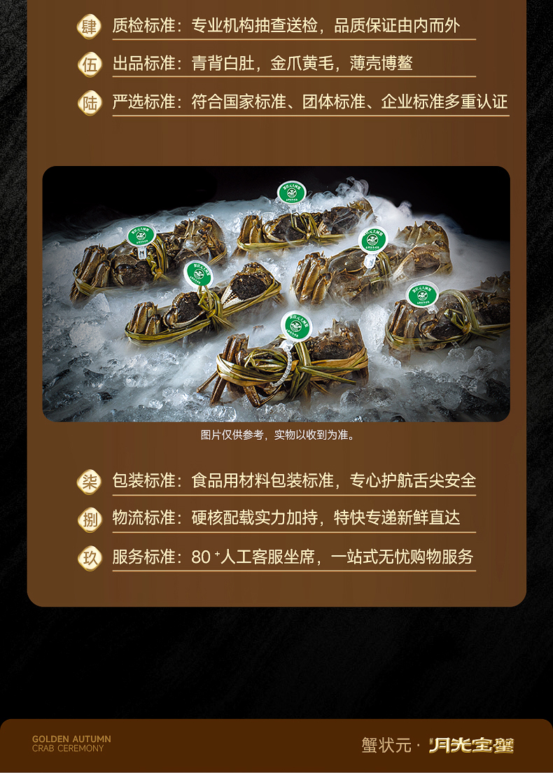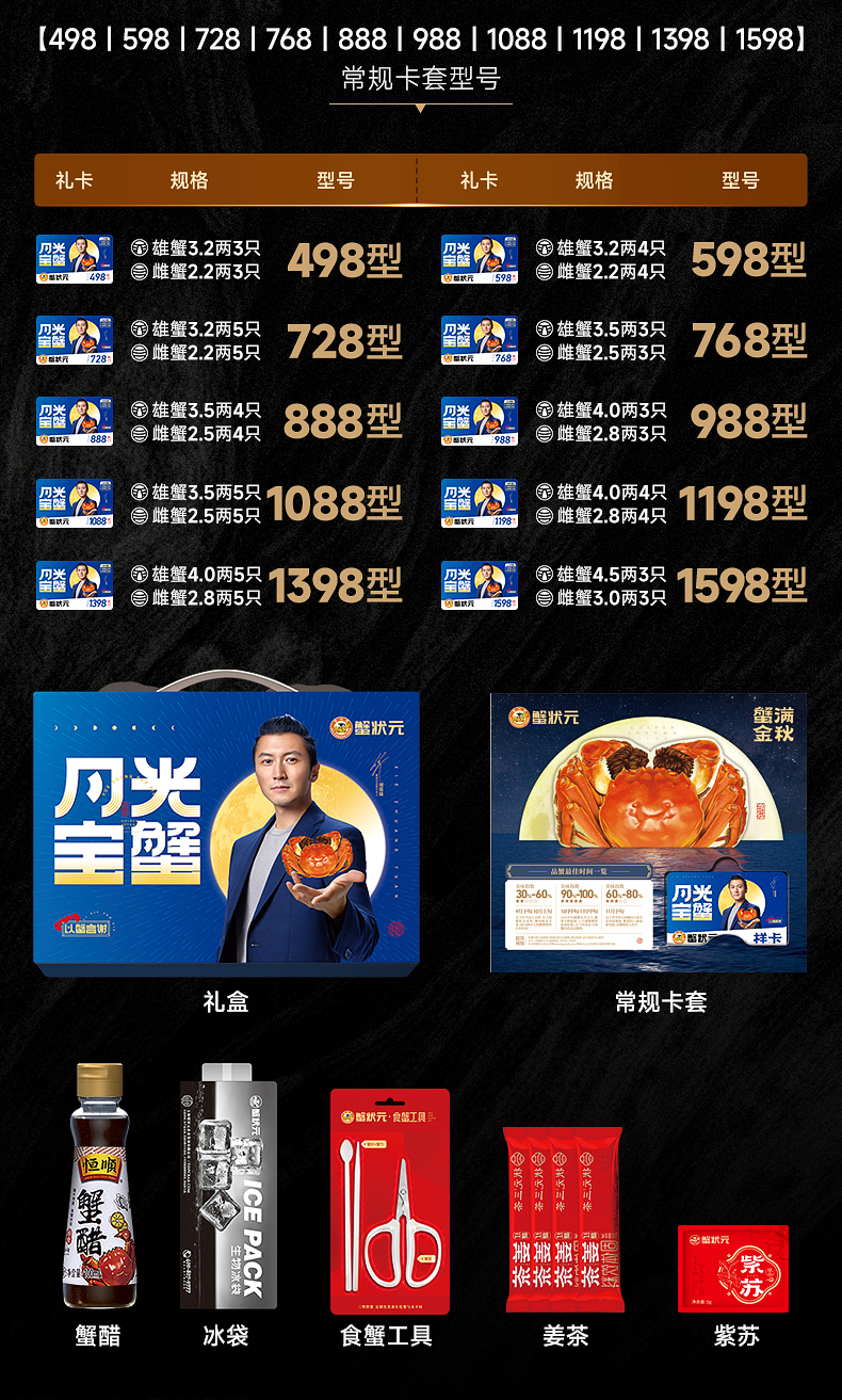 | 产品名称 : | 蟹状元大闸蟹2988型提货卡6只装F套餐 | 产品品牌 : | 蟹状元 |