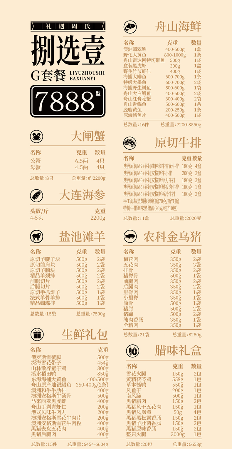 | 产品名称 : | 周氏海鲜7888型捌选壹礼券套餐 | 产品品牌 : | 周氏水产 |