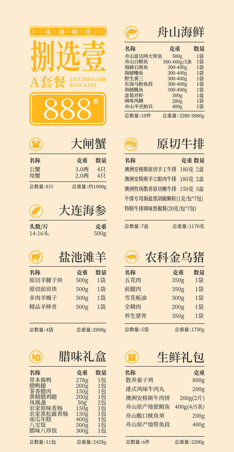 | 产品名称 : | 周氏海鲜888型捌选壹礼券套餐 | 产品品牌 : | 周氏水产 |