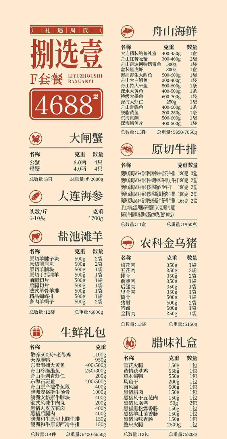 | 产品名称 : | 周氏海鲜4688型捌选壹礼券套餐 | 产品品牌 : | 周氏水产 |